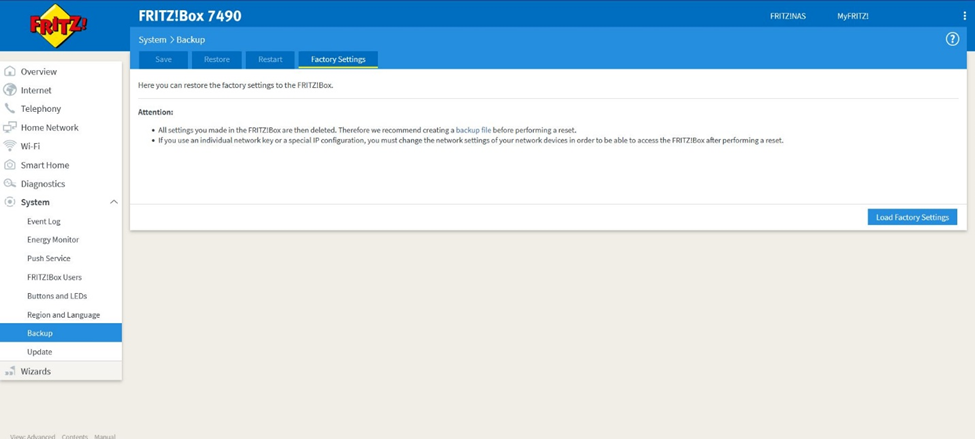 - Click on the “System” link, select the “Backup” sub-menu, then go to “Factory Settings” and apply “Load Factory Settings” -> confirm.